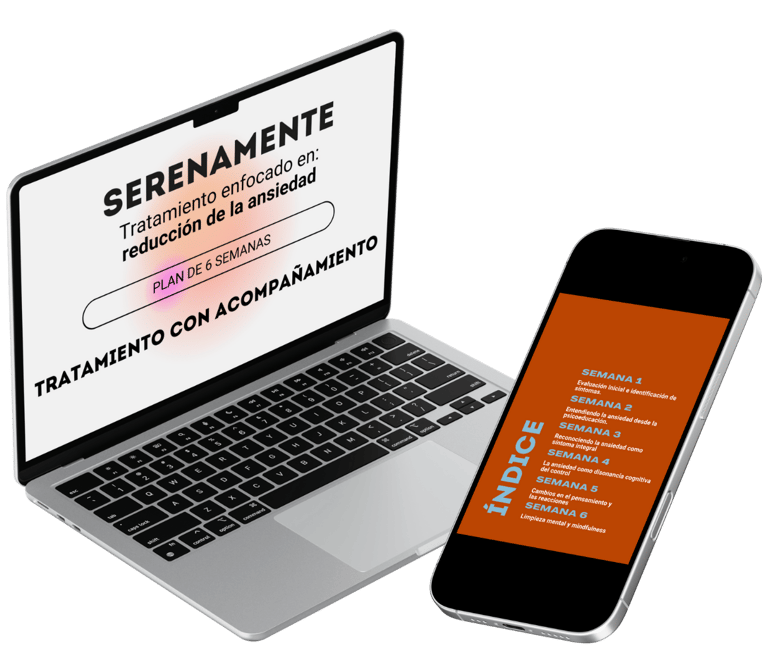 Serenamente es un tratamiento terapéutico de 6 semanas para reducir los niveles de ansiedad, reconectar contigo y cultivar bienestar emocional. A lo largo del proceso contarás con acompañamiento profesional en sesiones semanales de 50 minutos, un manual en PDF con recursos amorosamente diseñados, actividades semanales para integrar a tu vida y herramientas prácticas para regular tu sistema nervioso. Es un espacio íntimo y seguro para transformar tu ansiedad en claridad, presencia y equilibrio.